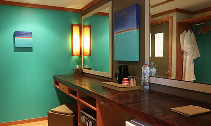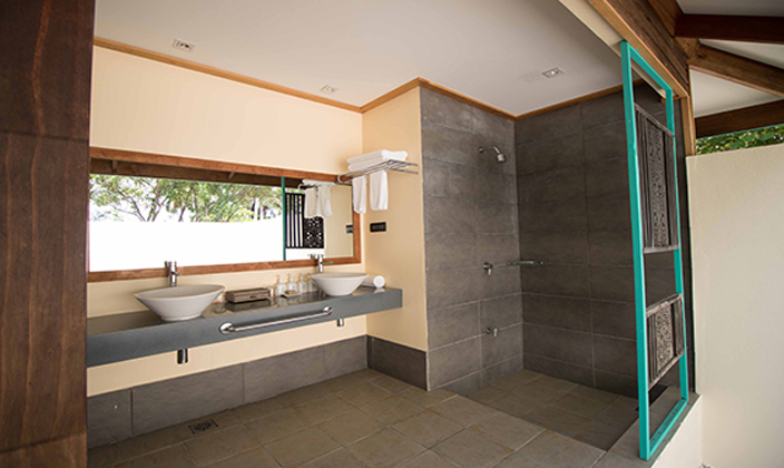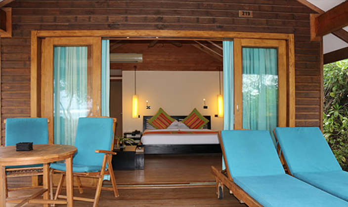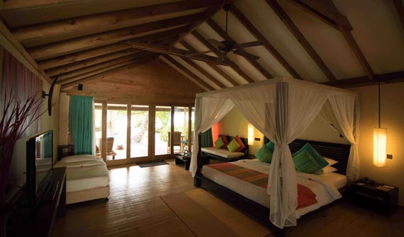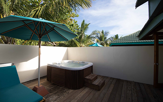 木質(zhì)陽臺(tái)風(fēng)格的住處,頗具當(dāng)?shù)匚幕厣?臻g開闊的瀉湖按摩沙灘別墅 (Lagoon Jacuzzi Beach Villas)提供了所有沙灘別墅的設(shè)施。其中包括大于58平方米的房間,熱帶風(fēng)格的四柱床,私人按摩浴缸,花園庭院。別墅造型設(shè)計(jì)極富當(dāng)?shù)匚幕厣F(xiàn)代化設(shè)施一應(yīng)俱全,長廊內(nèi)樹木茂盛。在此,旅客可飽覽長約4公里的海灘及島上藍(lán)色珊瑚礁的壯麗景致。