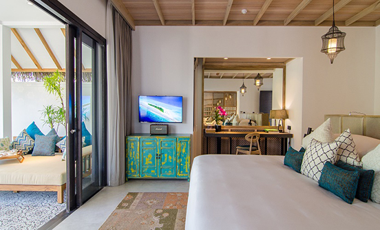 在豪華的熱帶花園特色的綠松石Finolhu瀉湖和太陽椅和花園寬敞的室外用餐露臺私人海灘,210平方米的摩爾風(fēng)的海灘別墅,配備了40英寸純平電視,私人葡萄酒和迷你酒吧。