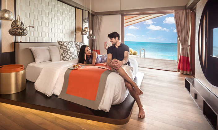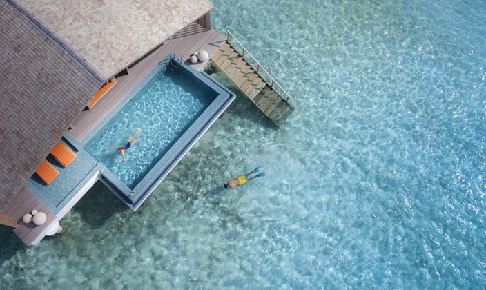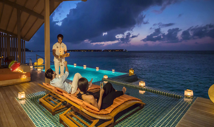 酒吧位于泳池旁,俯瞰水上小屋的精致秀美,如果真的有海上伊甸園,來這里暢飲一杯吧。酒吧白天和晚上全天營業,客人們可以在這里欣賞夕陽西下,以及天堂般的繁星點點的夜空。