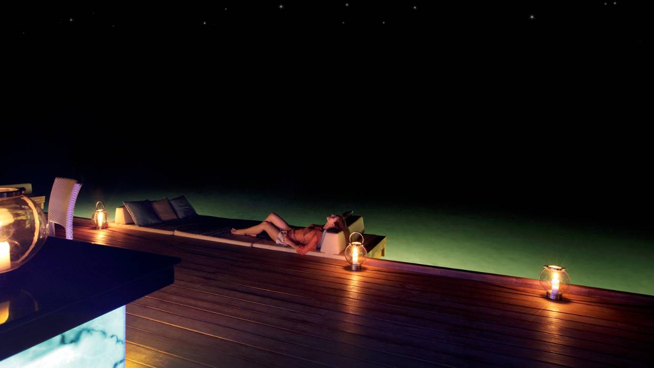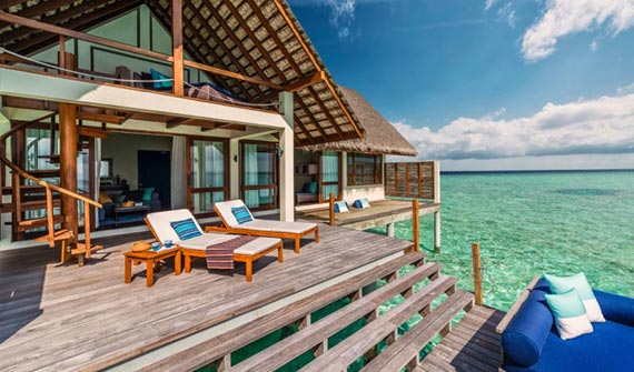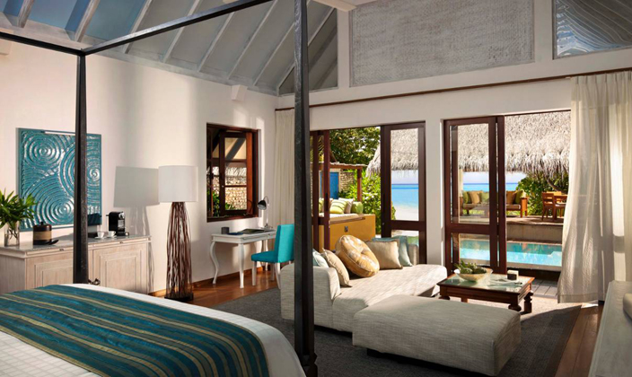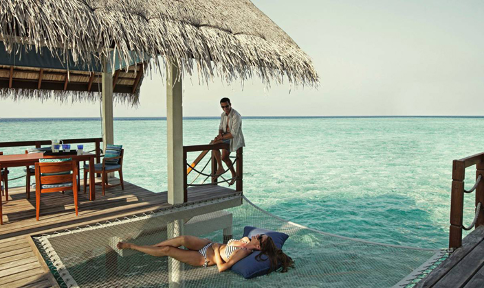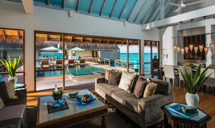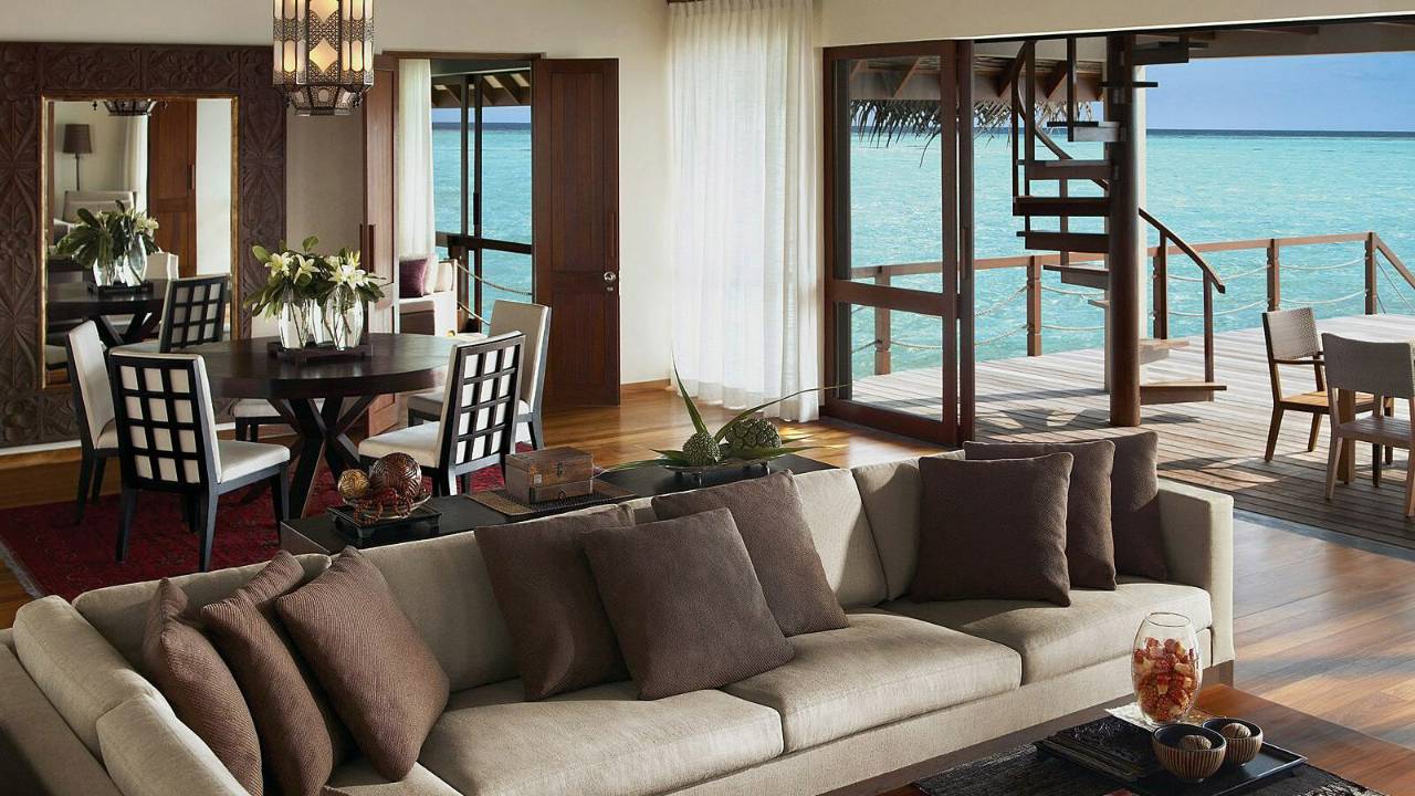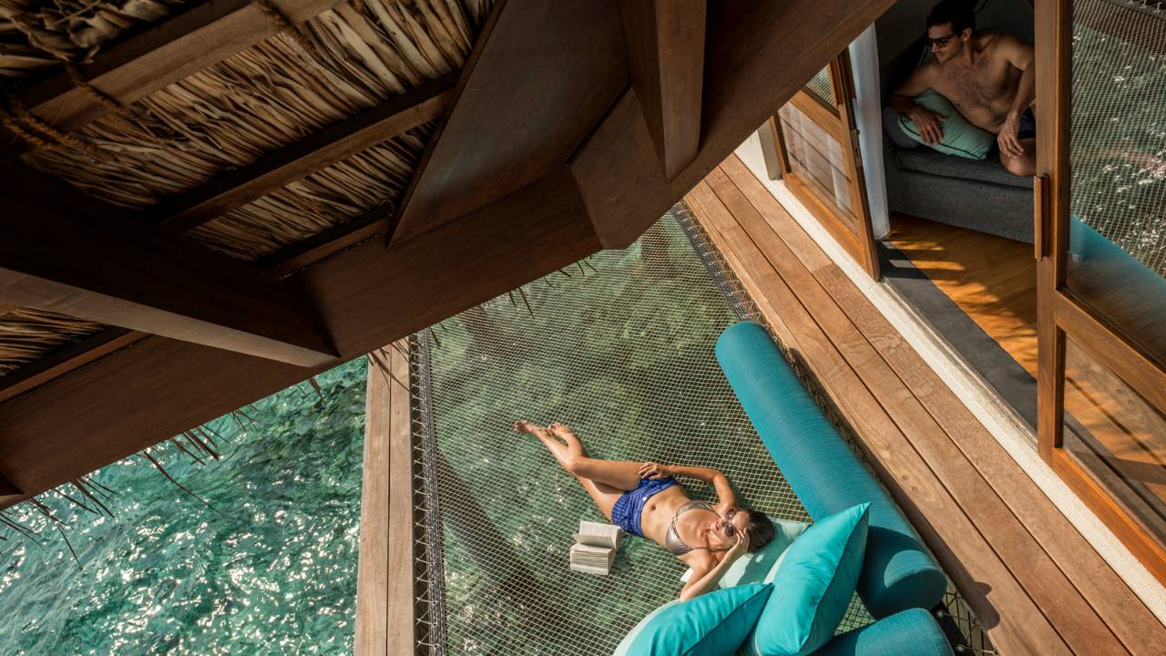 雙臥室海陸雙景套房不僅配備超大私人泳池、水上吊床、海景用餐平臺,并設有通往瀉湖的階梯,而且靠近色彩絢麗的Yin and Yang珊瑚花園,您可以盡情享受精彩紛呈的戶外活動。雙臥室海陸雙景套房別具風情,它懸浮于寧靜優雅的海面之上,您可在兩個亭閣式臥室之中隨心選擇,度過美妙迷人的海上一夜。