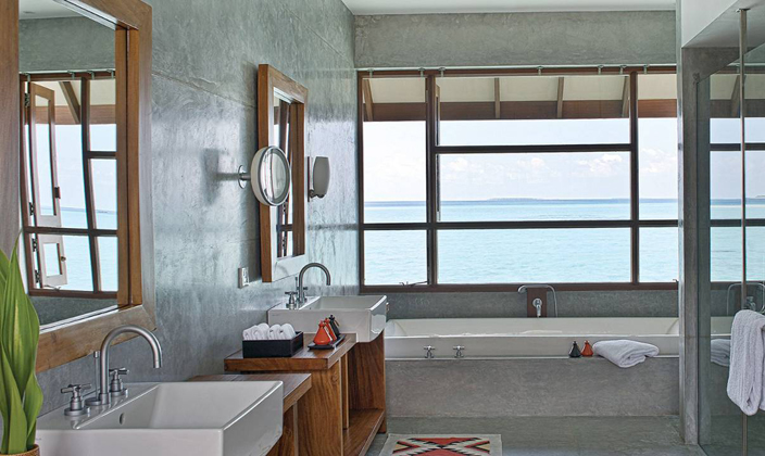 一間設施齊備的浴室和兩個室外淋浴間日出日落水上泳池別墅的水上吊床、海景閣樓和直通大海的臺階讓您充分感受瀉湖的情與景,躍身私人泳池