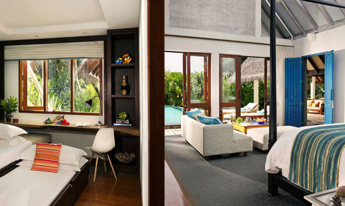 馬爾代夫蘭達吉拉瓦魯島四季度假酒店的家庭海灘別墅書房配備沙發床、書桌、電視,且毗鄰帶淋浴的浴室,帶有私家泳池,距離晶瑩剔透...查看更多