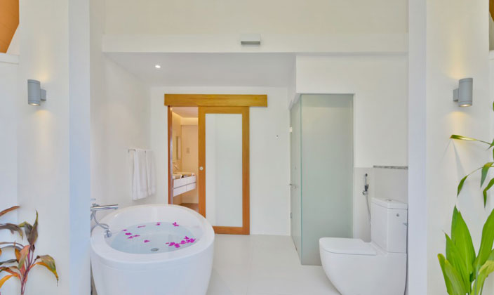 坐落在島的西側(cè),為兩層樓的別墅,地面層也有一個(gè)大衣柜和帶淋浴間,雙洗手盆,獨(dú)立的浴缸和獨(dú)立淋浴戶外花園浴室。在前面的陽臺(tái)設(shè)有一個(gè)室外沙發(fā)床和用餐區(qū)。一個(gè)單獨(dú)的露臺(tái)設(shè)有游泳池(18平方米),日光躺椅和太陽傘。上層設(shè)有一間寬敞而通風(fēng)的臥室配有特大床,第二間浴室。