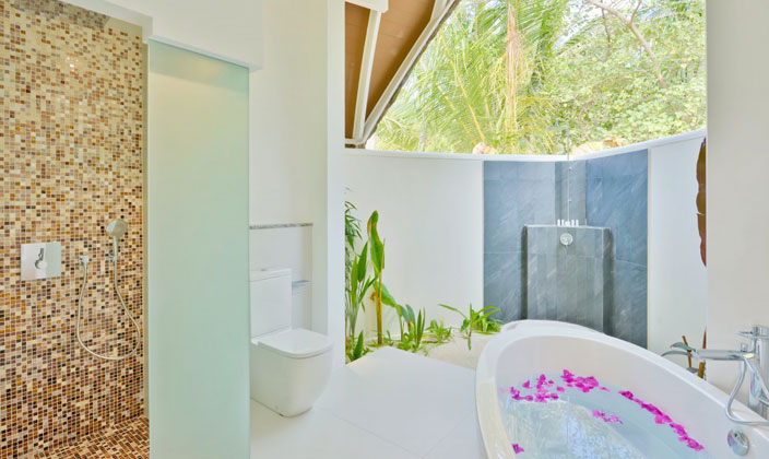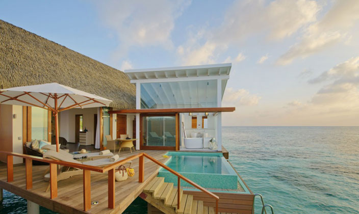 面對(duì)夕陽,海洋池在Kandolhu別墅提供最好的體驗(yàn)。每個(gè)人都有自己的私有走道到達(dá)和包括一個(gè)特大床,沙發(fā)床和衣櫥。浴室是開放的,通風(fēng),淋浴間,雙洗手盆和浴缸,私人甲板上設(shè)有躺椅,太陽傘和一個(gè)跳水池(7平方米),可以欣賞到印度洋的無限美景。