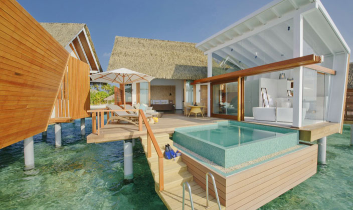 位于水面上,這些別墅設(shè)有寬敞的臥室配有特大床,沙發(fā)床,可欣賞到大海。浴室面臨的瀉湖設(shè)有按摩浴缸,雙洗手盆,淋浴和更衣區(qū)。陽光甲板的私人與躺椅,太陽傘,可直接下到海中。