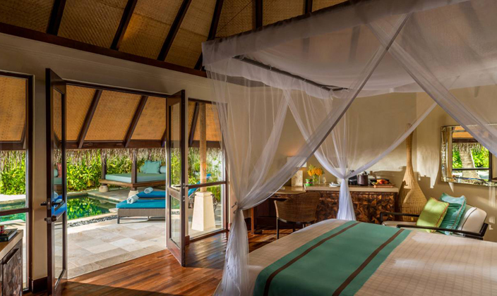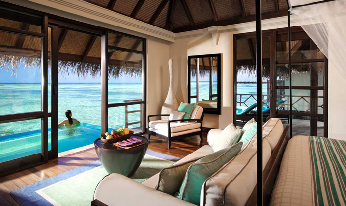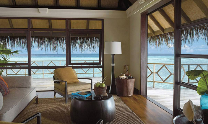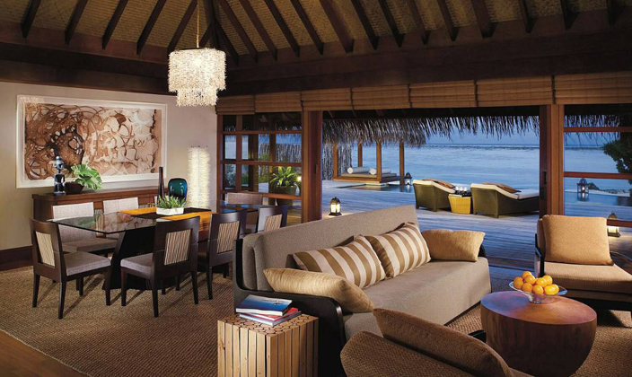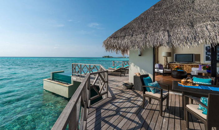 日出/日落單臥室水上套房采用傳統(tǒng)粉刷墻面和馬爾代夫茅草屋頂,室內則采用天然織物、藤制、柳編和深色橡木家具精心裝點,給您自然原生態(tài)的愜意氛圍。設有兩種露臺供您選擇,一種設有日光躺椅和通向礁湖的階梯,另一種設有私人露臺和室外泳池淋浴間。