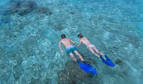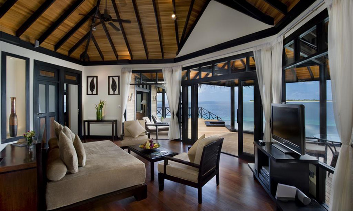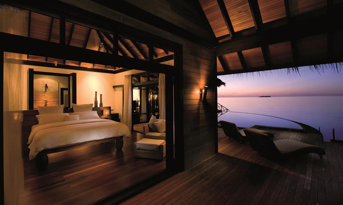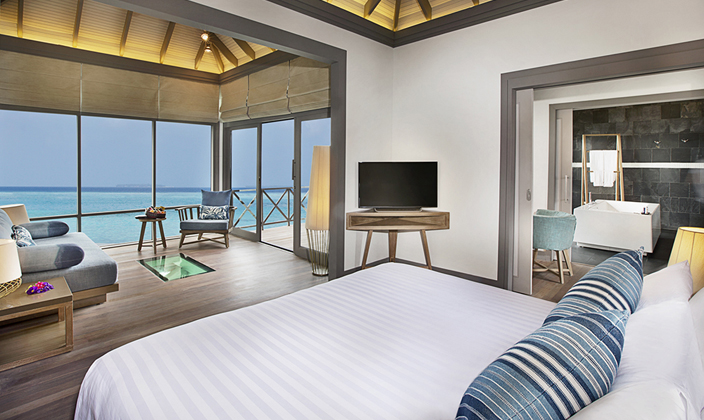在水上別墅的無邊泳池中戲水,領略印度洋的震撼景致。玻璃地板迤邐的海洋生態一覽無遺,推開房門便可踏進瀉湖,感受湖底的柔沙,讓湖水撫慰身心。