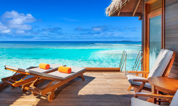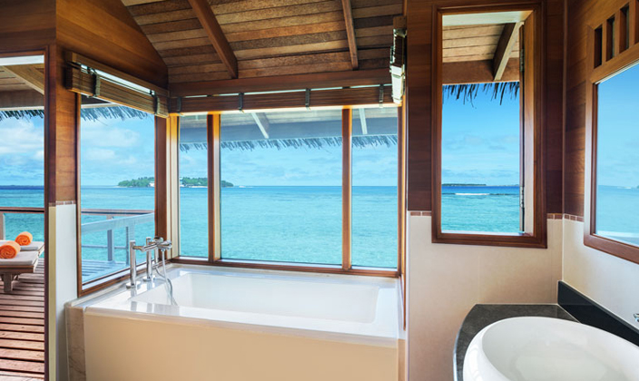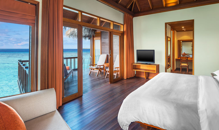 獨有的水上套房設有帶私人露臺的獨立休閑區以及時尚家具,其中包括舒適的藤制座椅和玻璃面桌子。 舒適宜人的臥室可俯瞰第二露臺區,并設有日光躺椅,可直通大海。 寬敞的浴室可直通兩座露臺,并設有一個舒適宜人的露天按摩池,是您放松休閑、飽覽變幻無窮的印度洋美景的絕佳之地。