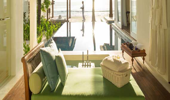 泳池海景房獻給您一覽無遺的蔚藍大海景色,是寧靜私密的終極之選。硬木平臺直伸大海,輕柔的海浪拍打著下面的礁石,將您帶入徹底的平靜之中。每棟泳池海景房還有一間私人海濱小屋,白天可以用于休憩和按摩,晚上則可用于共進晚餐。與泳池海灘小屋一樣,每棟泳池海景屋的風格和諧溫馨,配有典雅的硬木家具,色調明快,氣氛現代。裝修豪華的戶外浴亭配有雙人水磨石浴池、瀑布淋浴和私人蒸汽房,由九重葛和雞蛋花遮蔭,直達35平方米的私人無邊泳池。現代化的舒適便捷隨手可得。