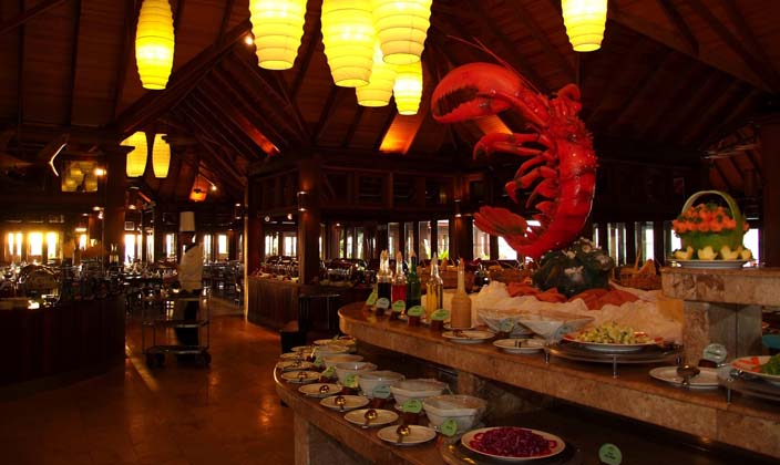 美食特色:國際美食。日落餐廳完全坐落在水之上,是雙魚島的主餐廳,提供一日三餐,各國口味菜肴定能滿足您的胃。有意大利菜,中國菜,東南亞菜,地中海菜,在露天的大甲板上,讓蜜月新人度過難忘的時刻,帶來愉悅的心情。