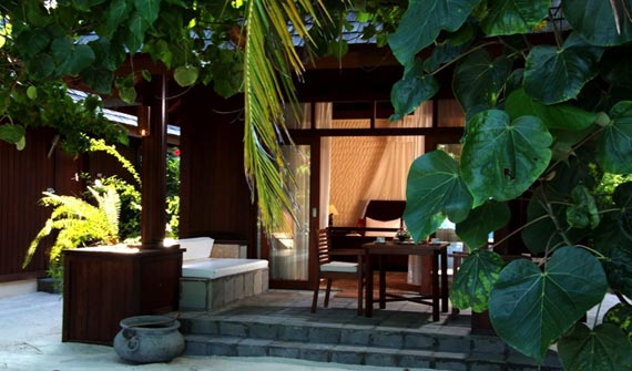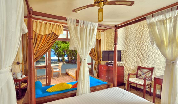 一棟客房有上下兩層共4個套房,都是面海而建,有露天陽臺。陽臺離海很近,站在陽臺上就可以俯視珊瑚海灘和瀉湖的美景。房中有起居室和寬敞的衛浴室,還包括舒適大床、沙發和衛星電視等。