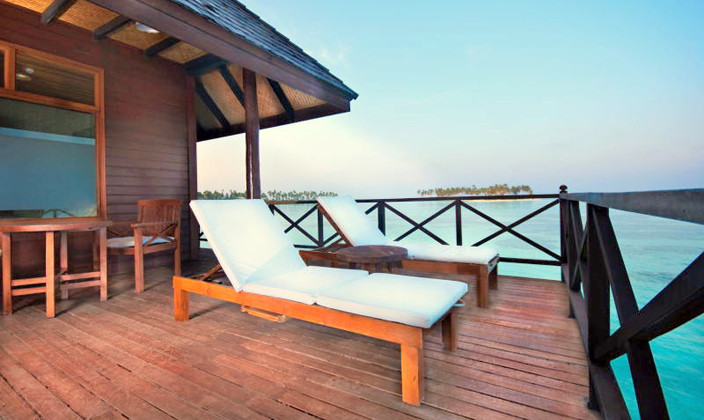 豪華水上別墅位于島嶼向海中延伸區域,每間房均設有向外延伸的陽臺,陽臺上有休閑躺椅,可進行日光浴。此外,還有一個上浮平臺,該平臺有一專用的樓梯延伸入海中,可由此進行浮潛觀魚。