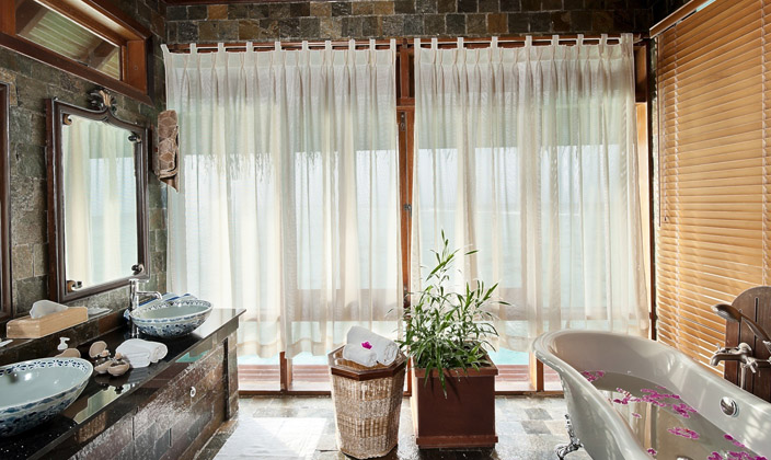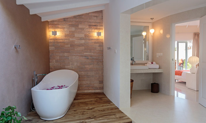 坐落在郁郁蔥蔥的植被之中,每個(gè)別墅擁有全景海景,可以俯瞰如畫(huà)海灘和瀉湖的風(fēng)景。全白色的室內(nèi)裝飾上了柔軟的熱帶色彩主題。橙色和粉紅色的閨房風(fēng)格沙一點(diǎn)神秘和浪漫。