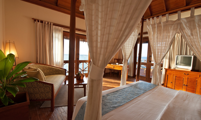 每個(gè)別墅擁有全景海景,可以通過(guò)私人樓梯直接進(jìn)入瀉湖,客人可以接近一大堆五顏六色的魚(yú)。