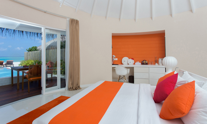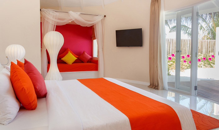 這個(gè)是一個(gè)新房型,從2015年2月開(kāi)始出售,房間比之前的沙屋更大,全白色的室內(nèi)裝飾上了柔軟的熱帶色彩主題。橙色和粉紅色為房間的主要風(fēng)格,增加了一點(diǎn)神秘和浪漫。全玻璃的推門(mén),有私人陽(yáng)臺(tái)俯瞰海灘,出門(mén)就是瀉湖沙灘。