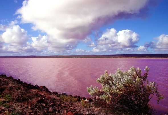 粉紅色的湖泊:在西澳大利亞南部海岸外,分布著一組由上百個小島組成的島嶼,名叫勒謝代群島。群島之一的中島一角掩映在濃密的桉樹和白千樹林之中,有一個閃耀著柔和色彩、如覆了一層粉紅色糖衣的湖泊。它看上去像一位巨人留在綠色厚地毯上鑲白邊的腳印。