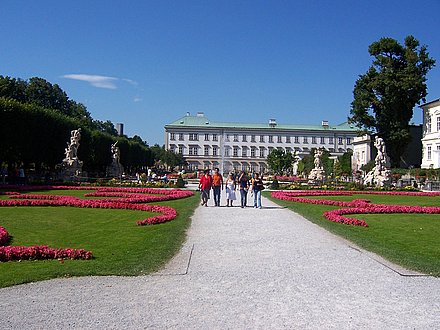 希臘神話而建造的人物形象,這里還有侏儒花園、巴洛克博物館和自然劇場?;▓@的旁邊是會議大廈和療養院。著名的《音樂之聲》就是在這里取的景。