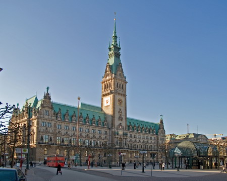 漢堡市政廳位于風光秀麗的內阿爾斯特湖邊,它背靠證券交易所,東連內阿爾斯特湖連拱走廊。用砂巖為建筑材料的豪華的市政廳,其建筑風格為新文藝復興風格。描繪有