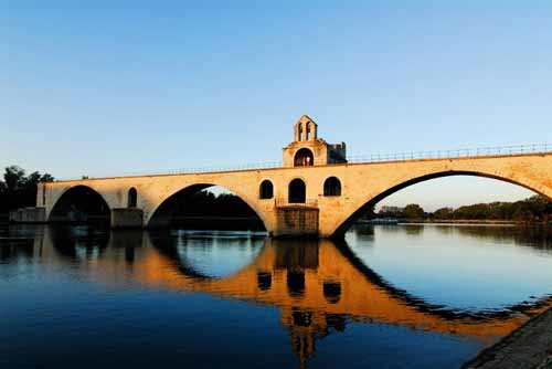 圣貝內(nèi)澤橋(Pont St-Bénézet),又叫阿維尼翁橋(Pont d'Avignon),建于1177年,傳說一位叫做貝內(nèi)澤的年輕牧人聽到圣音的指示,經(jīng)由天使的帶領(lǐng),花費(fèi)了8年的光陰建造了這條橋。圣貝內(nèi)澤橋因?yàn)橐皇卓蓯鄣耐{《阿維尼翁橋上》(Sur le Pont d’Avignon)而遠(yuǎn)近知名。