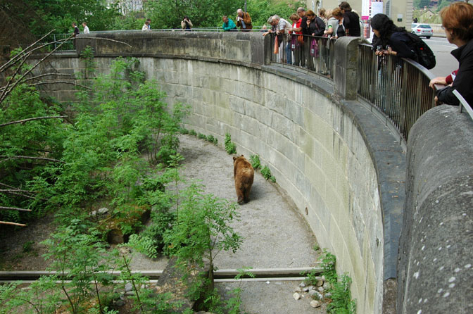 每逢節日,旅館、商店、機關、民宅的門前樓上,無不掛起飾有各種藝術造型熊標的大副彩旗,成為伯爾尼的一大景觀。就是平時,熊標彩旗也是處處可見。所以,伯爾尼也被稱為“熊城”。阿爾河的彎道東岸是已有500多年的歷史的熊苑。伯爾尼人對熊感情深厚,會經常來熊苑看望熊,復活節時人最多,若有了小熊仔,就會歡天喜地奔走相告,若有熊死了,就會難過許多天。