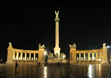 英雄廣場面向筆直的人民共和國大街,背后是著名的城市公園,兩側分別是匈牙利藝術館和匈牙利美術館。廣場用青白兩色水磨石鋪成,開闊得足能容下20 萬人。廣場上的主要建筑是以千年紀念碑為主體的群雕組成。廣場周圍沒有什么高層建筑物,因而廣場中央的千年紀念碑和人物群雕顯得異常突出。