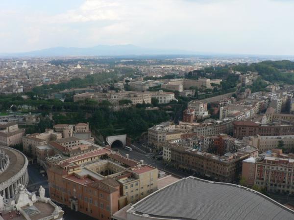 從這座教堂前的小廣場(chǎng)可以眺望羅馬的街景。臺(tái)伯河從左向右蜿蜒流淌。右邊有白墻的維托里亞諾,左邊是建有天文臺(tái)的蒙特•瑪里奧山丘。中間地帶是一些紀(jì)念碑。這是一條通往加里巴爾迪廣場(chǎng),綠樹(shù)成蔭適合散步的街道。