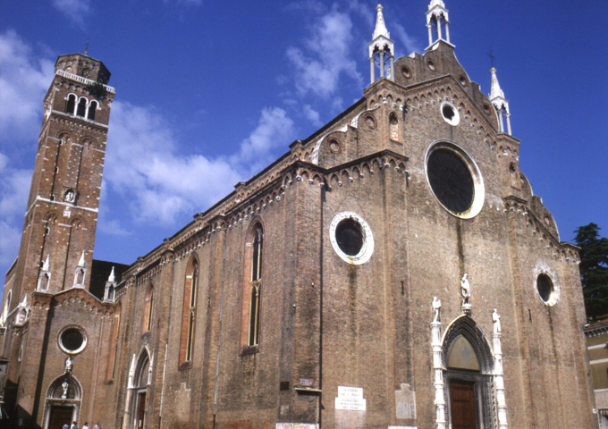 1250年,方濟(jì)各會(huì)獲得建造教堂的土地,直到1338年才建成。隨后幾乎立即又翻建為更大的教堂,即目前的這座,歷時(shí)一個(gè)世紀(jì)。其鐘樓僅次于圣馬可教堂,是威尼斯第二高鐘樓,完成于1396年。