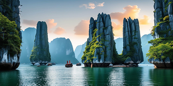 ※【下龍灣】下龍灣是越南北方廣寧省的一個海灣,風光秀麗迷人,聞名遐邇。風景區共分為東、西、南3個小灣。因其景色酷似中國的桂林山水,因此被稱為“海上桂林”1994年,聯合國教科文組織將下龍灣作為自然遺產,列入《世界遺產名錄》。下龍灣各小島嶼典型的形式為伸出海面的鋸齒狀石灰巖柱,還有一些洞穴和洞窟,共同形成一幅異國風味的如畫景致。水域和熱帶森林中可見各種不同的海生及陸生哺乳動物、鱷、魚類和鳥類。