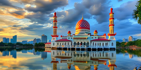 ※【粉紅水上清真寺】(約 20 分鐘)該寺位于馬來西亞新行政中心布城,整座寺有四分之三建筑在布拉特湖上,也被人們稱為水上清真寺。因其頂部花崗石砌成的粉紅色屋頂,視覺效果超棒。