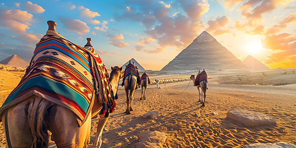 【吉薩金字塔群】【獅身人面像】(含首道門票入內參觀約2小時),午餐后前往參觀世界七大奇跡之一,古埃及文明的象征,位于尼羅河三角洲的吉薩高原。主要由胡夫、哈夫拉、孟卡拉三大金字塔組成,其中胡夫金字塔高146.6m,為世界之最。這些金字塔建于公元前2600至2500年,是古埃及法老的陵墓,見證了古埃及的輝煌與智慧。獅身人面像是古埃及文明的神秘象征,坐落于吉薩的哈夫拉金字塔旁。它結合了獅子的身體和人類的面孔,代表著力量與智慧的結合。這座雕像歷經千年風雨,依然屹立不倒,凝視著遠方的尼羅河,見證了古埃及的興衰。結束后入住酒店休息。