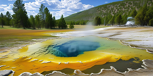 【大棱鏡彩泉】(The Grand Prismatic Spring): 是美國最大,世界第三大的溫泉。它寬約 75 至 91 米, 49 米深,每分鐘大約會涌出2000 公升,溫度為71°C 左右的地下水。大棱鏡溫泉是黃石溫泉的杰出代表,其直徑超過百米,從中心向外呈現出藍綠黃橙紅等不同的顏色, 是面積最大、色彩最美的一處景觀。