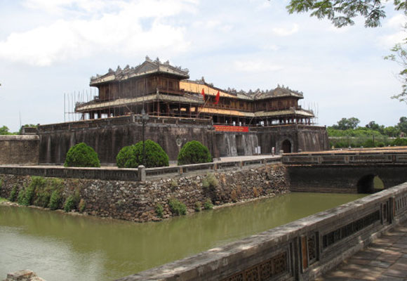 首先是順化皇宮。這座古老的宮殿臨江而建,在越南著名的香江邊上,它的背面就是御屏山,是個四四方方的古代宮殿式的建筑群?;蕦m的四條邊都是兩點五公里長,外面圍繞著一圈護城河,城墻足足八米高,厚度達到了二十米,而且都是用磚頭砌成的,能夠抵御外敵的入侵。古城的四周一共有十個城門,每一個城門都高達十六米左右,這里,是古代官員們辦公的地方,內部設有國子監、機密部、內閣等部門。這里,也是順化最有名的皇城。