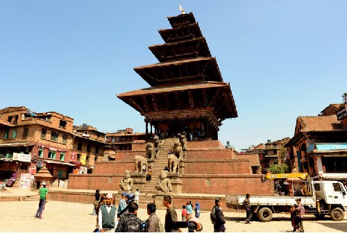 這座優雅的寺廟建于1702年布彭德拉.馬拉國王統治時期。它的設計和建筑非常堅固,1934年的大地震只對其造成了很小的破壞。在通往寺廟的臺階兩側分列這五對雕像,每層塔基上各有一對。