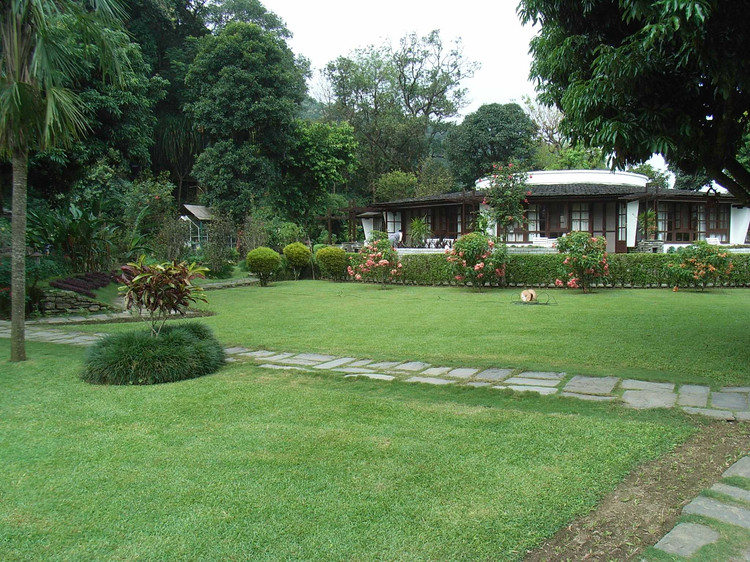 整個小島就是一座熱帶植物的花園,紅艷熱剌的花朵開遍每個角落。鵝卵石鋪成的小路通向每個安靜的房間,樹枝上搖晃著鐵皮雕花的燈罩,古樸美麗。房間都是一個有青石屋頂的低矮平房,門前有小花園,白色的涼椅,可以在室外喝下午茶。房間更是可愛,在窗邊有長長的臥榻,依在窗邊,可以看湖光山色。如果天氣足夠好,還可以看到云霧繚繞間積雪的山頂。