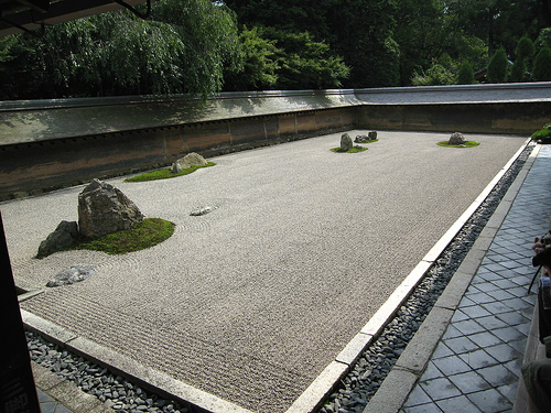龍安寺是世界文化遺產,1450年由細川勝元德大寺家出讓的別院改建成禪寺。這里的方丈庭園是東西走向的長方形庭園,庭中鋪以白沙,配有15塊大小不同的石頭,是聞名于世的枯山水庭園。石頭放置奇特,不管從哪個角度看,均有一塊石頭隱身不見。
