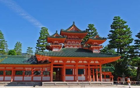 神宮是公元1895年為紀(jì)念平安遷都1100年而建的。其形狀是按照平安京八分之五縮圖設(shè)計的。綠色和紅色相映的主殿后面有三個池塘和四座庭園。神宮祭奉桓武天皇和孝明天皇。正殿里的神苑是日本池泉回游式庭園的代表杰作。院內(nèi)以一株「八重紅枝垂櫻」而盛名遠播,每年四月櫻花怒放之際,此一樹櫻花垂如流蘇,十分美艷。在棲鳳池一帶,更可看到千多棵各色櫻花爭相開放。