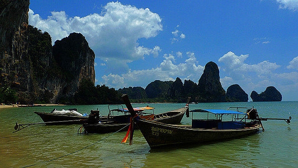 甲米鎮的長尾船,西萊雷有發往奧南海灘的長尾船。