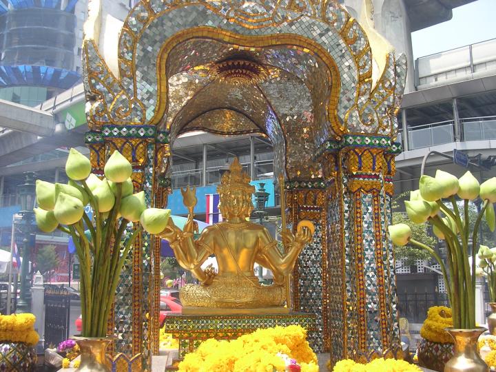 泰國各地包括住家庭院內(nèi)多有設(shè)置。而以此處香火最為旺盛,從早到晚周圍擺滿了鮮花和香燭等貢品,還可以聘請穿傳統(tǒng)服裝的少女起舞歌唱。該四面佛2006年曾經(jīng)被毀過,現(xiàn)已重新修繕。