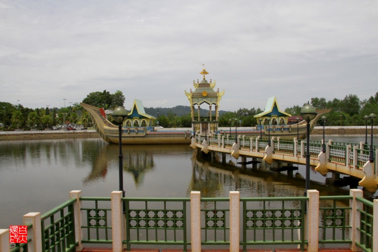 蘇丹奧瑪爾·阿里·賽福鼎的名字命名,紀(jì)念他建國17年來的功績(jī)。整個(gè)建筑巍峨高大,莊嚴(yán)肅穆,其巨大圓形金頂和鏤空乳白色尖塔,雄偉豪邁,可供千人禮拜,是當(dāng)之無愧的伊斯蘭文化中心。清真寺被湖水環(huán)繞,湖面平幽如鏡,一艘仿文萊16世紀(jì)皇家游船的石舫,浮在碧水之中,樹木繁盛,構(gòu)成一幅美麗的天然圖景。