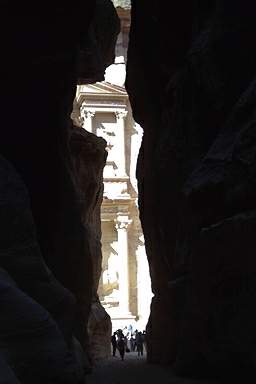蛇道(塞格小道)是佩特拉的門戶,實際上是一條長1公里、高達近百米的巖石裂縫。走在其中,令人不能不驚嘆大自然的鬼斧神工,同時羨慕佩特拉人的好運,竟然可以找到這樣一個天然的庇護所。在那霸田人和羅馬時期,小道曾經(jīng)熱鬧非凡,來往的商旅都把佩特拉作為中途休息和貿(mào)易的地點。小道時寬時窄,曾經(jīng)平整的石砌路面現(xiàn)在布滿礫石,崎嶇不平,只留下部分殘段,兩側(cè)筆直的峭壁幾乎在頭頂碰在一起,現(xiàn)在的小道幽暗寂靜,不復(fù)昔日繁華。在兩側(cè)石壁上有兩條水槽的遺跡,有的地方還殘留著陶制水管,那霸田人將山外的摩西泉水通過水槽引到“宮殿墓室”上方的儲水池里,可貯存2500立方米,供佩特拉城中居民飲用。
